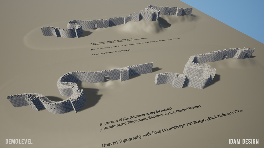 The meshes are designed to work seamlessly in the system, replacing the wall meshes with desired meshes. Using randomize feature, and an array of mesh choices, fortwalls can be created with a natural real feel. With snap to landscape and stepping features, you can create authentic-looking fortifications.